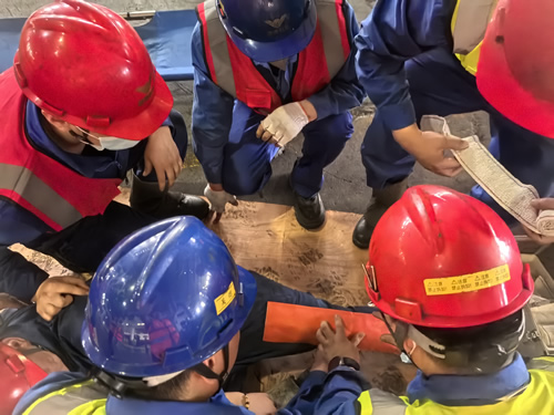 《有限空間事故專項應(yīng)急預(yù)案》演練模擬了在 FM10基坑內(nèi),下夾緊缸故障維修過程中,作業(yè)人員未進(jìn)行有毒有害介質(zhì)有效隔離,未實(shí)施停電,掛牌進(jìn)入有限空間,未執(zhí)行有限空間作業(yè)審批“先通風(fēng)、后檢測、再作業(yè)”規(guī)定,導(dǎo)致一名維修人員中毒、窒息、昏迷,同時作業(yè)現(xiàn)場內(nèi)有刺鼻異味。監(jiān)護(hù)人員發(fā)現(xiàn)異常后,立即報告并呼叫救援。應(yīng)急救援人員迅速穿戴好防護(hù)裝備,攜帶空氣呼吸器、擔(dān)架等救援設(shè)備進(jìn)入有限空間,將昏迷員工轉(zhuǎn)移至安全區(qū)域,并進(jìn)行心肺復(fù)蘇等急救措施,成功將“傷員”從危險中解救出來,展現(xiàn)了公司在應(yīng)對有限空間事故時的專業(yè)救援能力。
